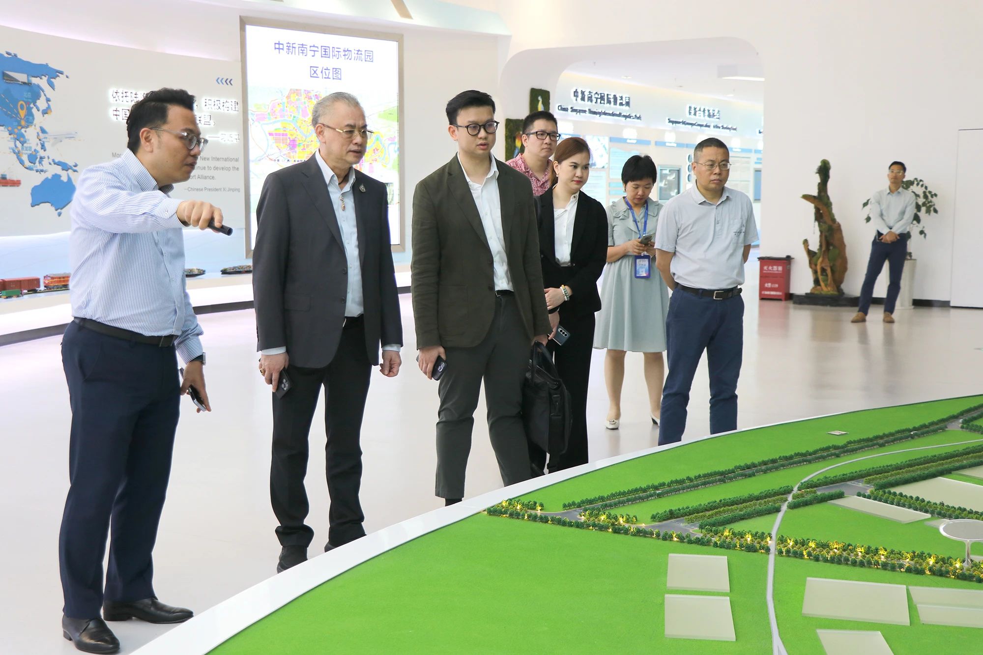 在中新物流園展示中心,考察團(tuán)一行深入了解項(xiàng)目的整體情況。作為國際陸海貿(mào)易新通道上重要的物流樞紐節(jié)點(diǎn)項(xiàng)目之一,園區(qū)堅(jiān)持以“強(qiáng)中選強(qiáng),優(yōu)中選優(yōu)”重點(diǎn)引進(jìn)大型物流龍頭企業(yè)為招商理念和工作方針,目前已引進(jìn)超30家世界500強(qiáng)和中國100強(qiáng)龍頭企業(yè)進(jìn)行合作,共同實(shí)施項(xiàng)目建設(shè)和運(yùn)營。同時(shí),為能更好地?fù)屪CEP新發(fā)展機(jī)遇,中新物流園與時(shí)俱進(jìn)不斷創(chuàng)新,于2021年聯(lián)合中國—東盟博覽會(huì)秘書處共同打造了獨(dú)具特色的匯聚中心,通過線上數(shù)字化平臺(tái)+線下展館沉浸式商貿(mào)體驗(yàn)相結(jié)合的方式,致力于搭建一個(gè)中國與東盟、RCEP其他區(qū)域國家乃至“一帶一路”沿線重要國家線上線下經(jīng)貿(mào)往來的一站式首選平臺(tái)。