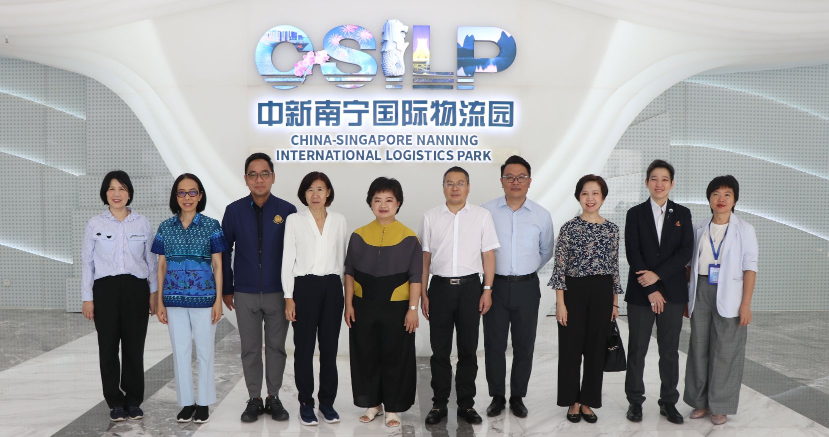 2023年6月30日,泰國(guó)商業(yè)部巡視組組長(zhǎng)(副司級(jí))素南塔.剛婉古吉女士一行到中新南寧國(guó)際物流園(以下簡(jiǎn)稱“中新物流園”)、中國(guó)—東盟特色商品匯聚中心(以下簡(jiǎn)稱“匯聚中心”)考察,就進(jìn)一步提升中泰兩國(guó)在經(jīng)貿(mào)領(lǐng)域的合作與交流展開探討。廣西新中產(chǎn)業(yè)投資有限公司副總經(jīng)理商紅熱情接待了巡視組一行。