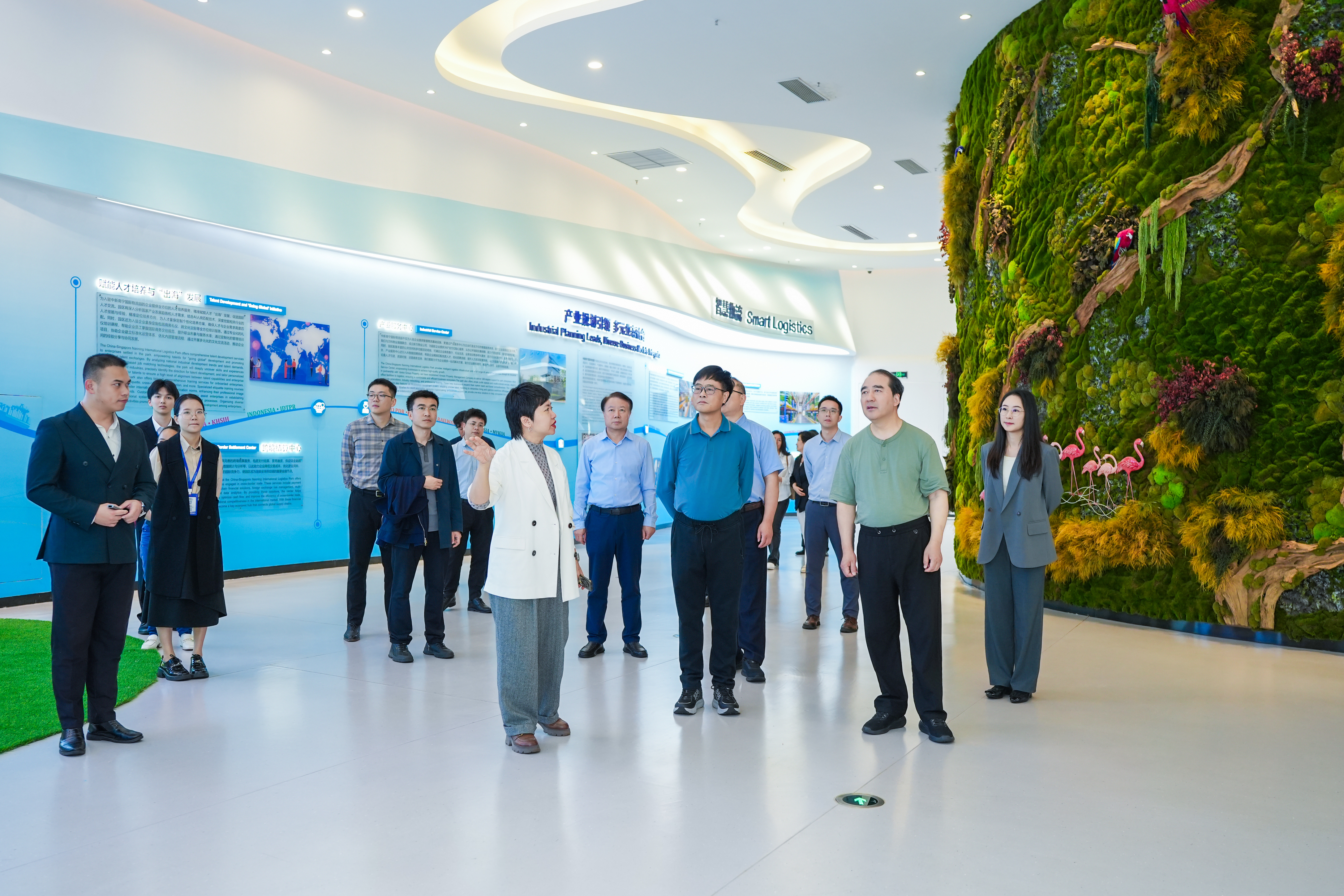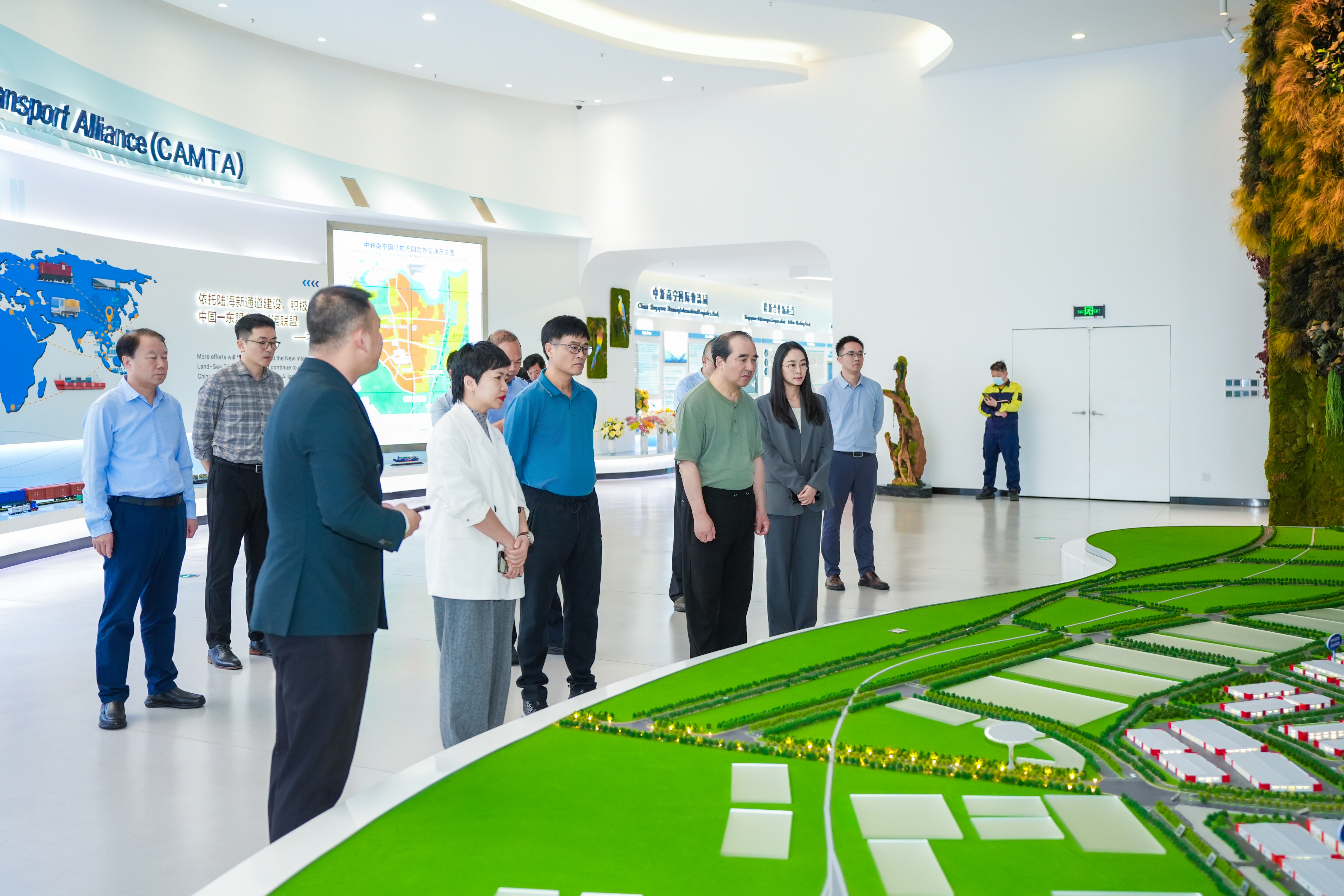 在中新物流園展示中心,調(diào)研組詳細(xì)聽取了園區(qū)的建設(shè)及運(yùn)營(yíng)情況介紹。作為國(guó)際陸海貿(mào)易新通道(簡(jiǎn)稱“陸海新通道”)上中國(guó)與新加坡合作的旗艦型示范項(xiàng)目,中新物流園多式聯(lián)運(yùn)優(yōu)勢(shì)突出,且自身配套有大型物流倉(cāng)儲(chǔ)和冷鏈等設(shè)施,為內(nèi)陸省份企業(yè)開拓東盟市場(chǎng)提供了更便捷高效的物流支撐,助力國(guó)際貨物貿(mào)易優(yōu)化升級(jí)、持續(xù)擴(kuò)大我國(guó)對(duì)內(nèi)對(duì)外開放格局。值得關(guān)注的是,作為陸海新通道的骨干工程,平陸運(yùn)河將于今年9月中國(guó)—東盟博覽會(huì)期間通航,屆時(shí)物流效率將顯著提升、運(yùn)輸成本合理降低,也將進(jìn)一步拓展園區(qū)的貨物集聚能力和輻射半徑,釋放更大經(jīng)貿(mào)聯(lián)動(dòng)效能。
