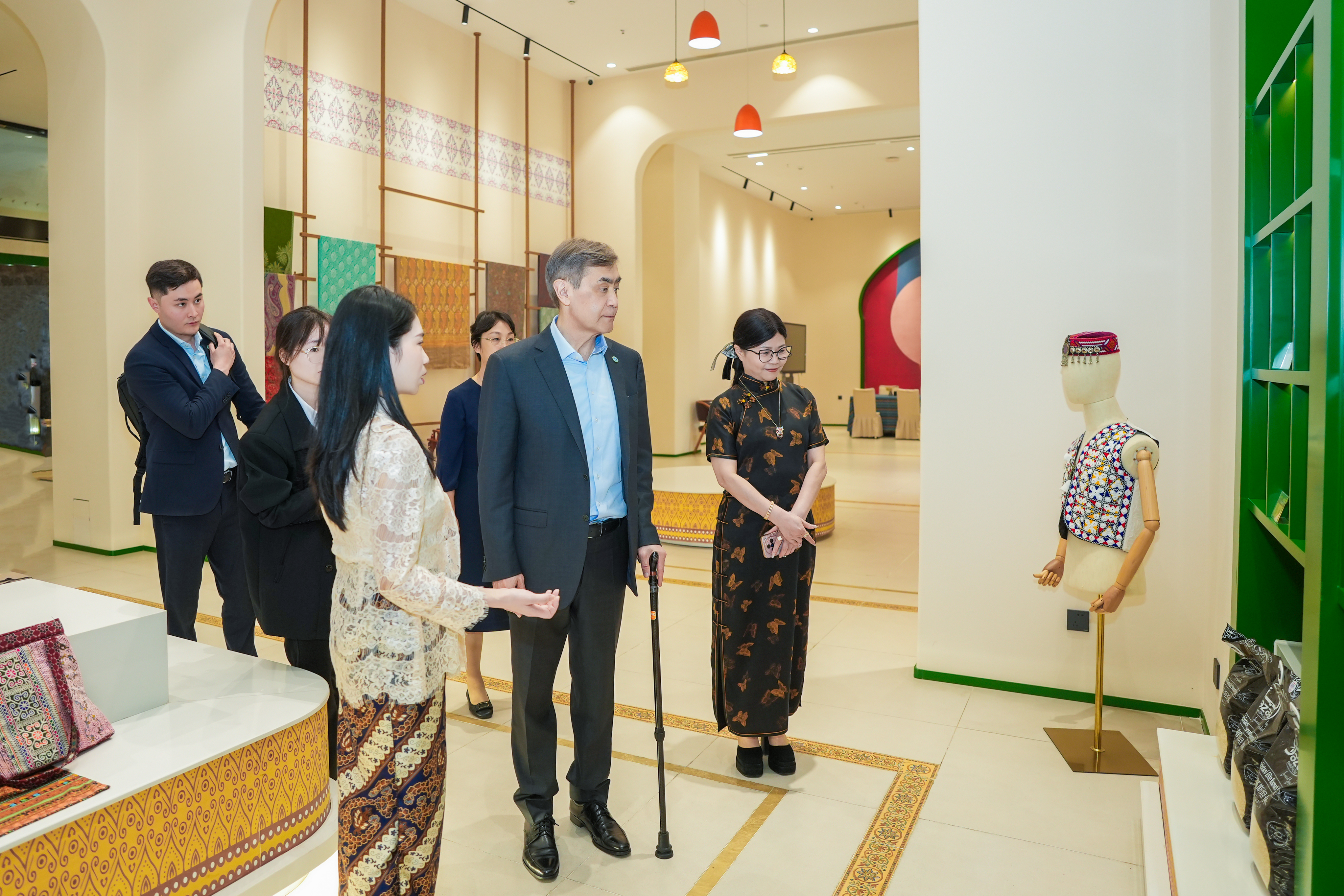 在匯聚中心多個文化主題館,努爾蘭·葉爾梅克巴耶夫秘書長聽取了項目的建設背景、發(fā)展現(xiàn)狀及未來規(guī)劃等介紹。他指出,匯聚中心搭建的國際化商貿(mào)平臺,把中國與東盟、RCEP其他區(qū)域國家乃至“一帶一路”沿線的特色好物匯集于此,為全球客商與消費者提供了便捷選購與洽談合作的優(yōu)質(zhì)環(huán)境,這一創(chuàng)新模式具有重要推廣意義。
